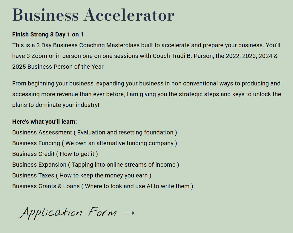 I am going to start of my saying that if you are serious about your business, then Coach Trudi is serious about you! One of my favorite things about Coach Trudi is how she challenges me. She doesn’t allow me to sit in my fear or my sorrows too long! She stretches me to become my best for my clients. Hire her immediately! You will thank me later!